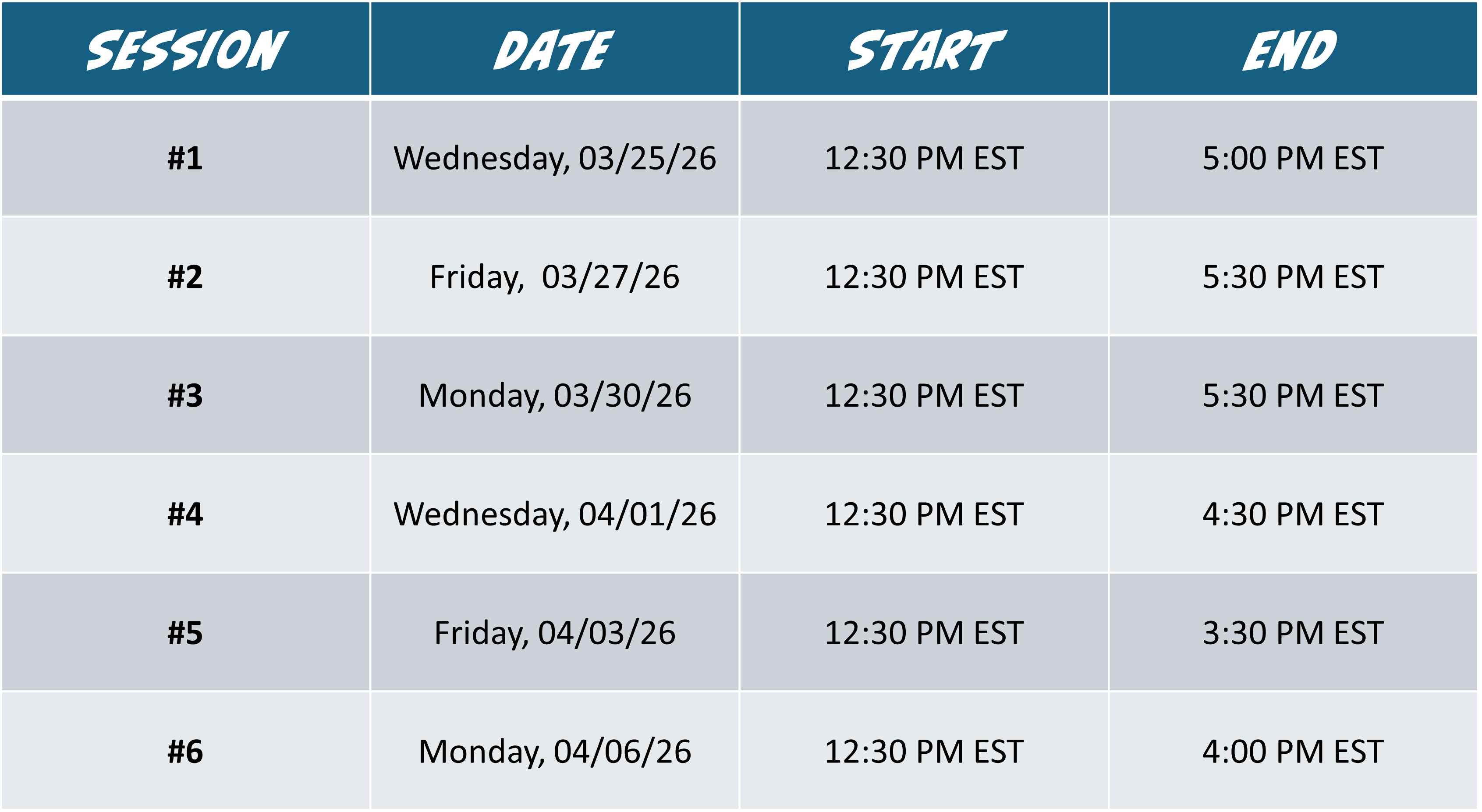 After completion of the self-paced M&A Bootcamp Digital materials, the live virtual sessions start on March 25, 2026. Each session begins at 12:30 Eastern. Sessions last three to five hours. See below for the complete schedule.